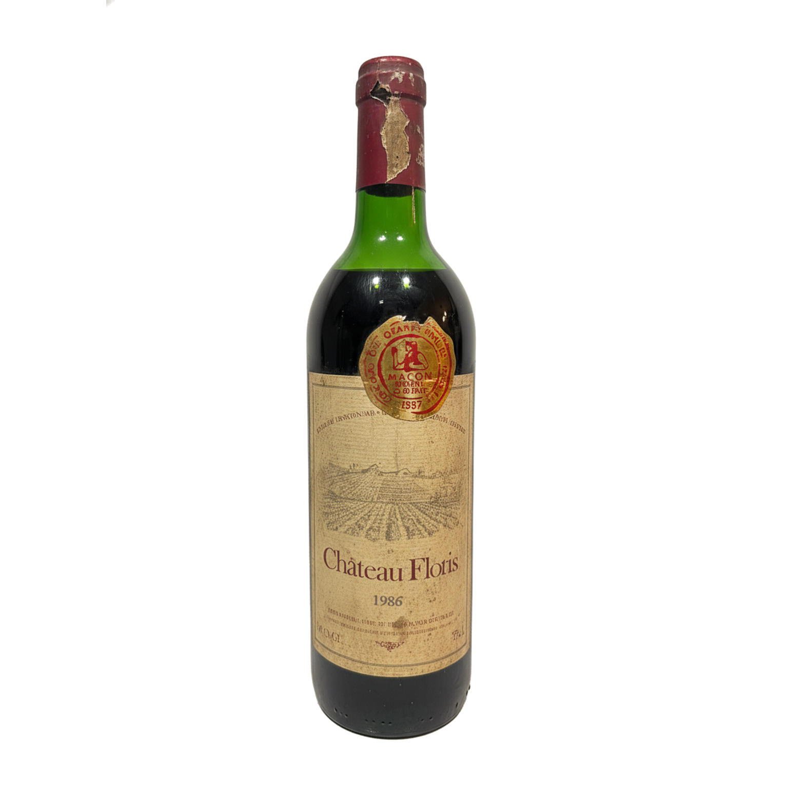 Label shows significant aging with yellowing and some staining. The paper appears aged and weathered but remains intact and readable. Red wax capsule shows some wear and cracking but is mostly intact. The bottle shows typical signs of aging for a 1986 vintage with some dust and sediment visible.