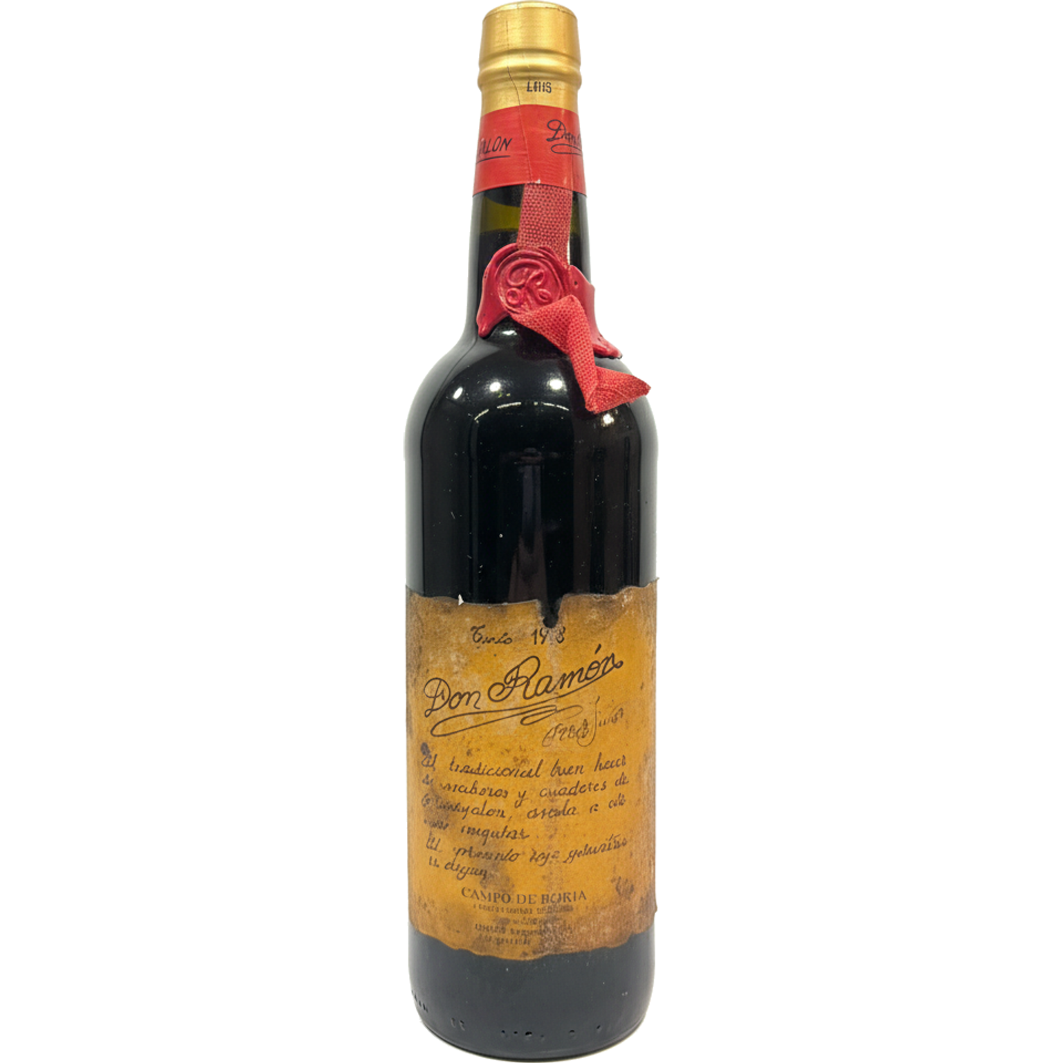 The bottle shows significant signs of aging. The label is weathered and partially damaged with torn edges and faded text. The original tan/beige label shows wear and staining consistent with long-term storage. The capsule appears to be gold-colored and is intact. There's a red ribbon or seal around the neck area which appears to be part of the original packaging. The bottle itself appears structurally sound despite the aged appearance of the label.
