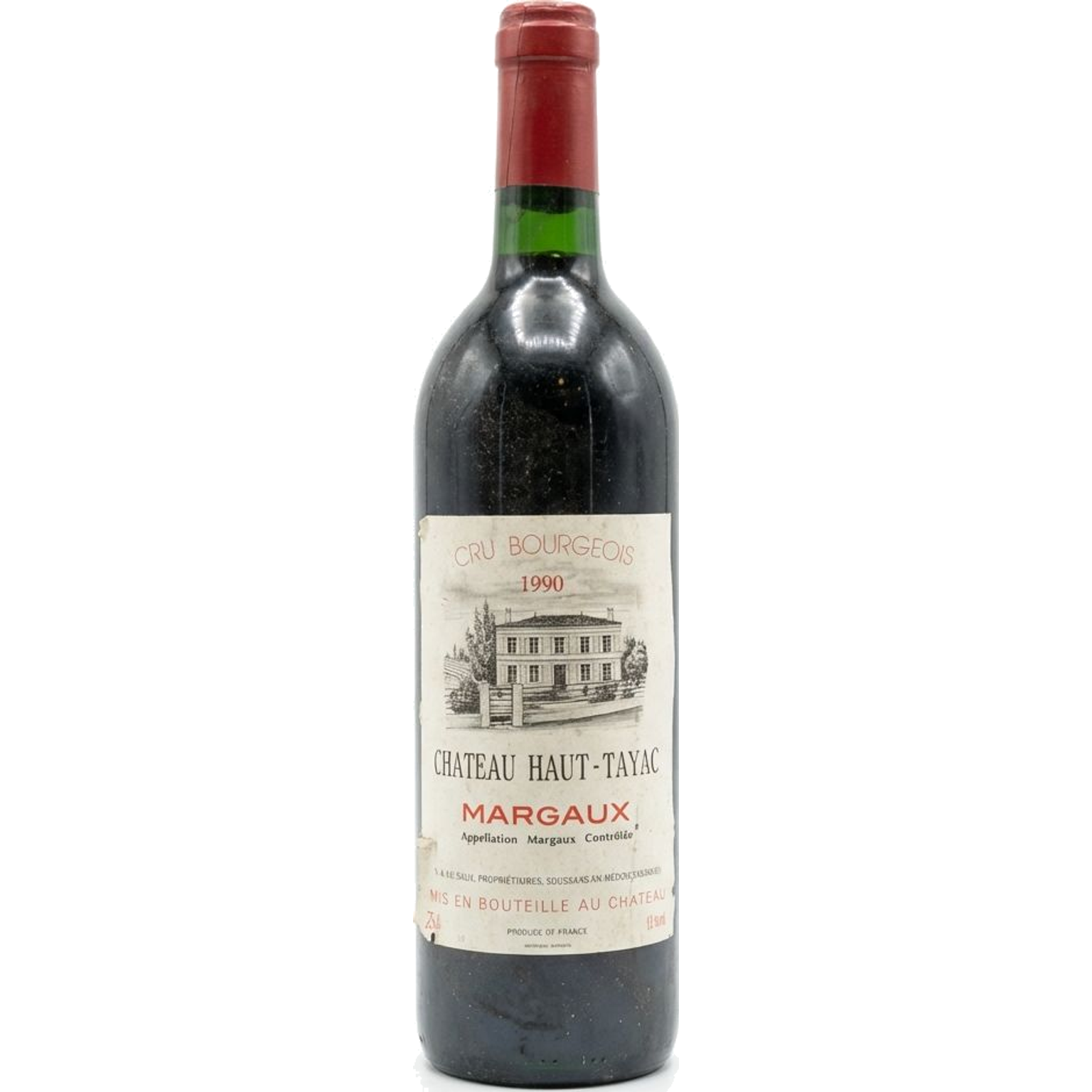 The label is intact and slightly aged with minor wear. Capsule is intact. The bottle appears dusty indicating proper storage.