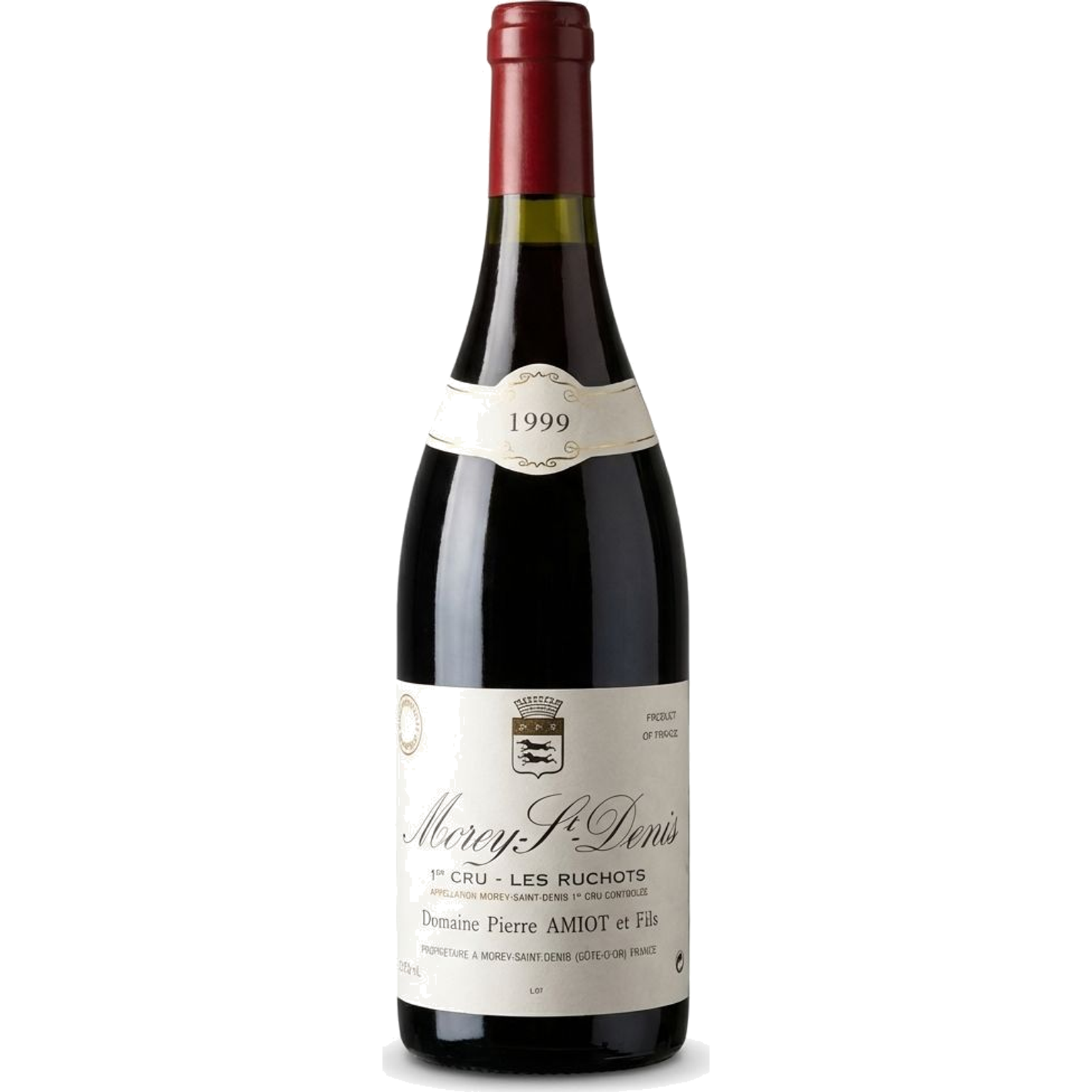 Label appears to be in good condition with clear text and intact appearance. The white label shows some minor aging but remains legible with the coat of arms and text clearly visible. Capsule appears intact in burgundy/red color. Bottle stored in wooden case.