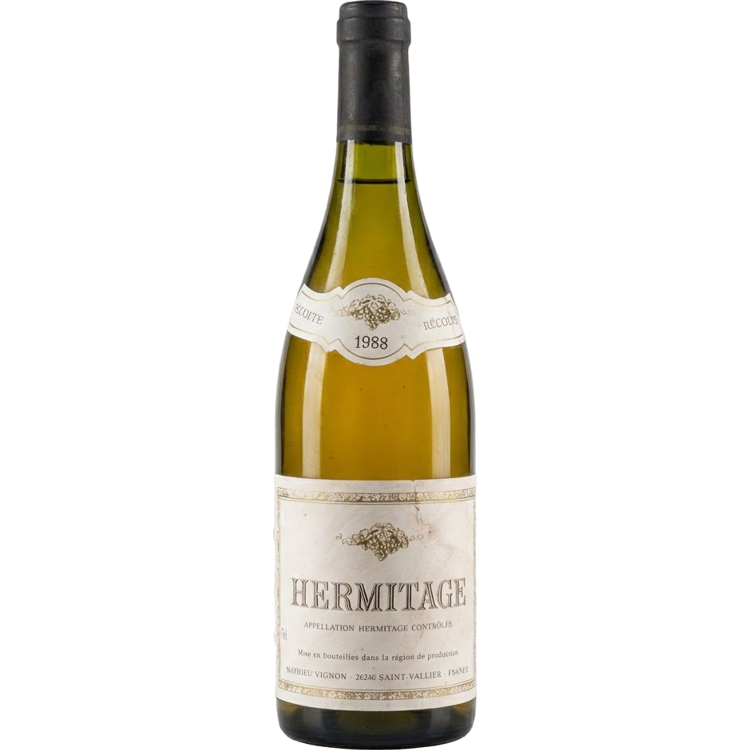 The label is intact with slight signs of aging. The capsule appears intact but dusty. The bottle shows no signs of damage.