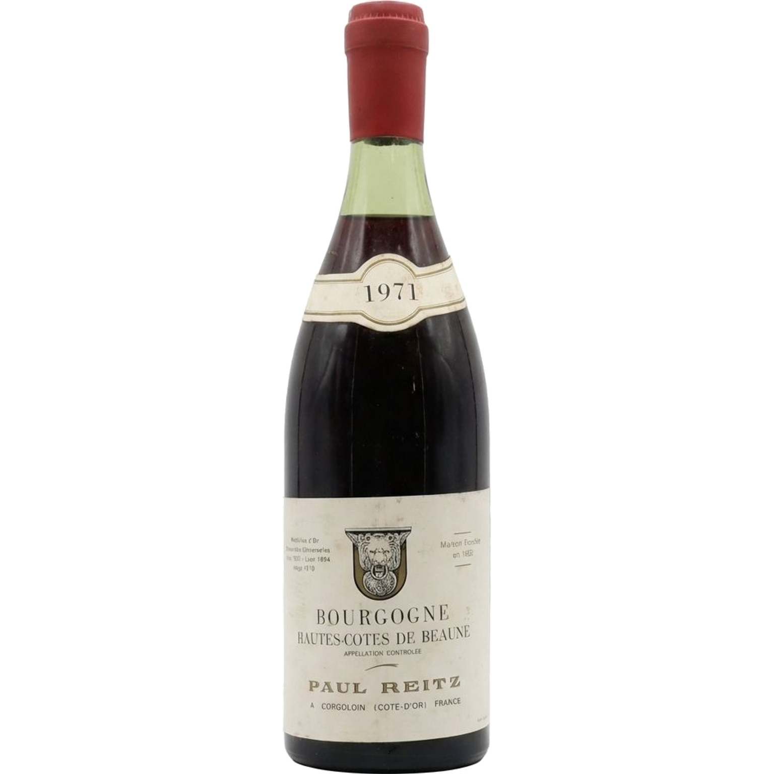 Label appears to be in good condition with clear text and intact borders. The white label with black text is well-preserved. Red capsule appears intact. The bottle shows some age-related darkening of the wine visible through the glass, which is normal for a 1971 vintage.